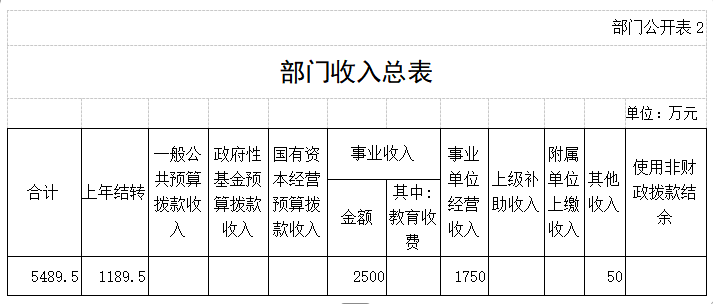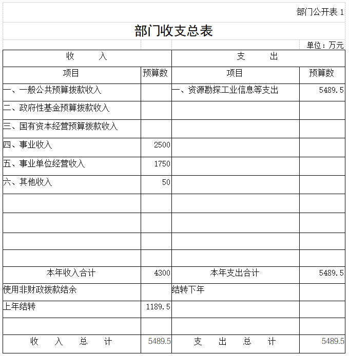 按照综合预算的原则,中心所有收入和支出均纳入部门预算管理。收入包括:事业收入、事业单位经营收入、其他收入;支出包括:资源勘探工业信息等支出。2026年收支总预算5,489.50万元。